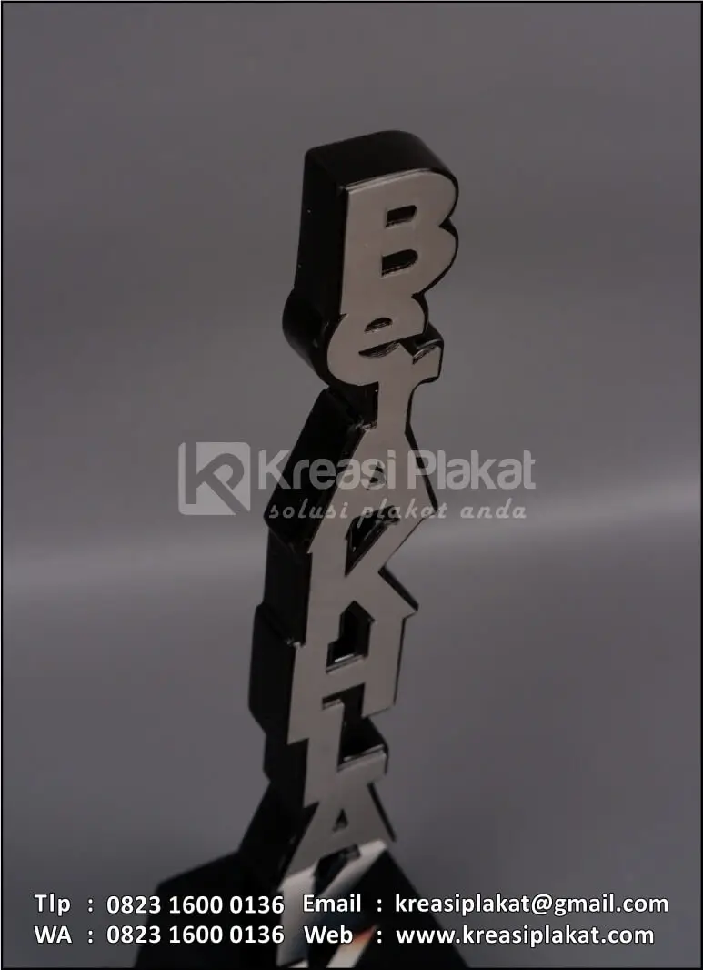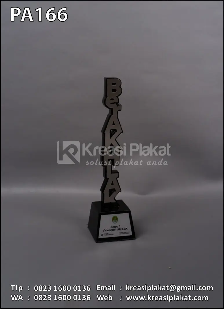 Plakat Akrilik Juara Video Ber-AKHLAK terbuat dari bahan akrilik model desain custom huruf vertikal susun. Untuk bagian dudukan menggunakan bahan kayu solid hitam doff.