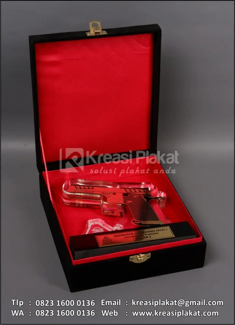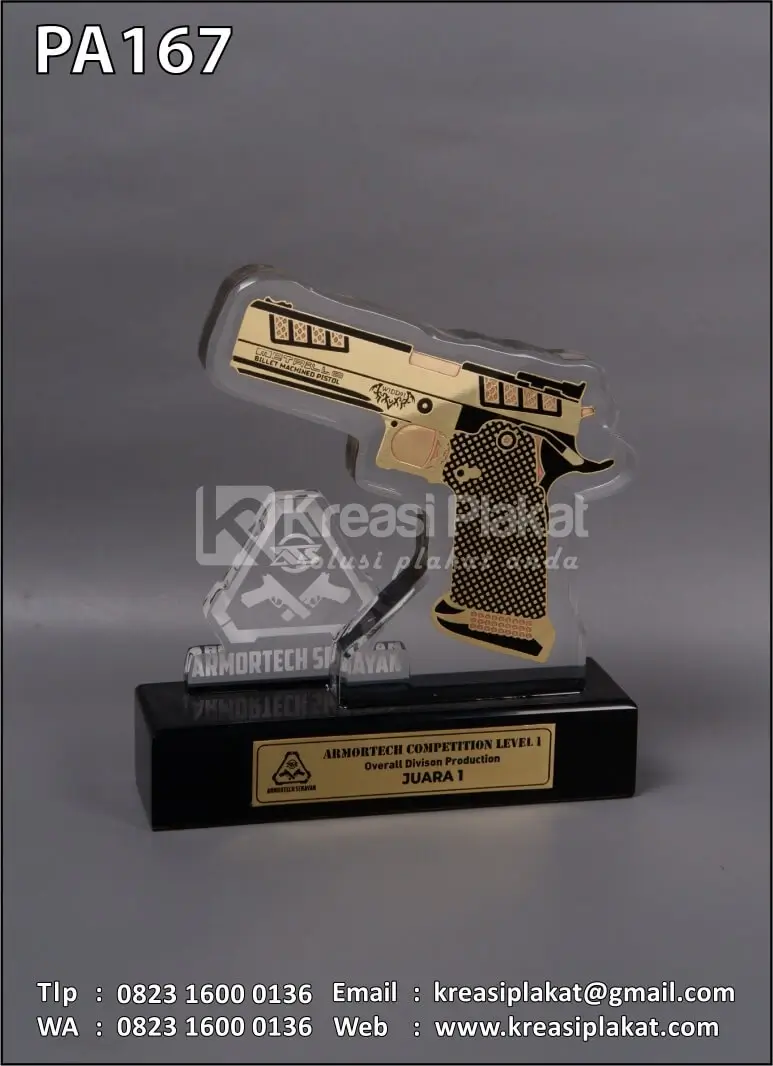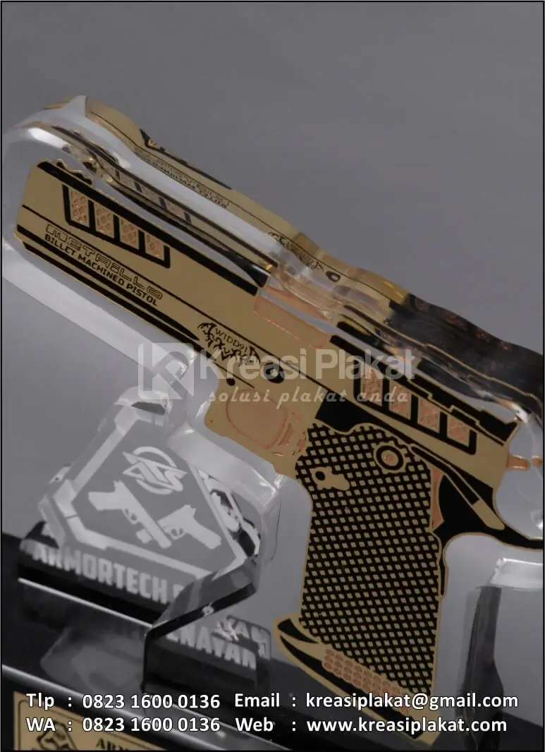Plakat Akrilik Armortech Competition Level terbuat dari bahan akrilik & kombinasi logam kuningan etsa model desain custom senjata api. Untuk bagian dudukan menggunakan bahan kayu solid hitam doff.