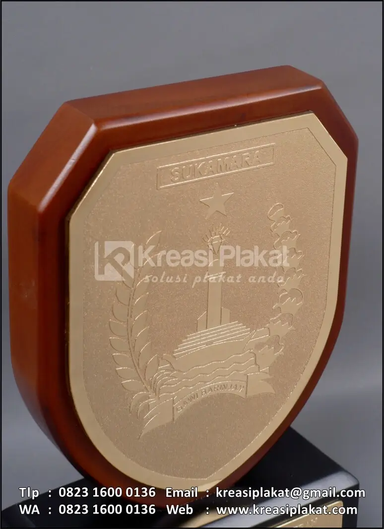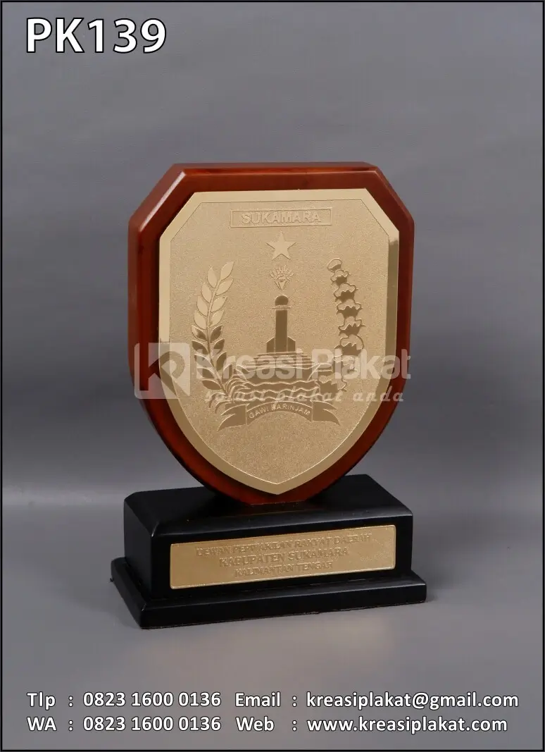 PK139 Plakat Kayu DPRD Kabupaten Sukamara ini dibuat dari perpaduan bahan kayu dan logam kuningan finishing etsa masir chrome emas, plakat ini menampilkan custom desain perisai, mencerminkan kemewahan dan keunikan.