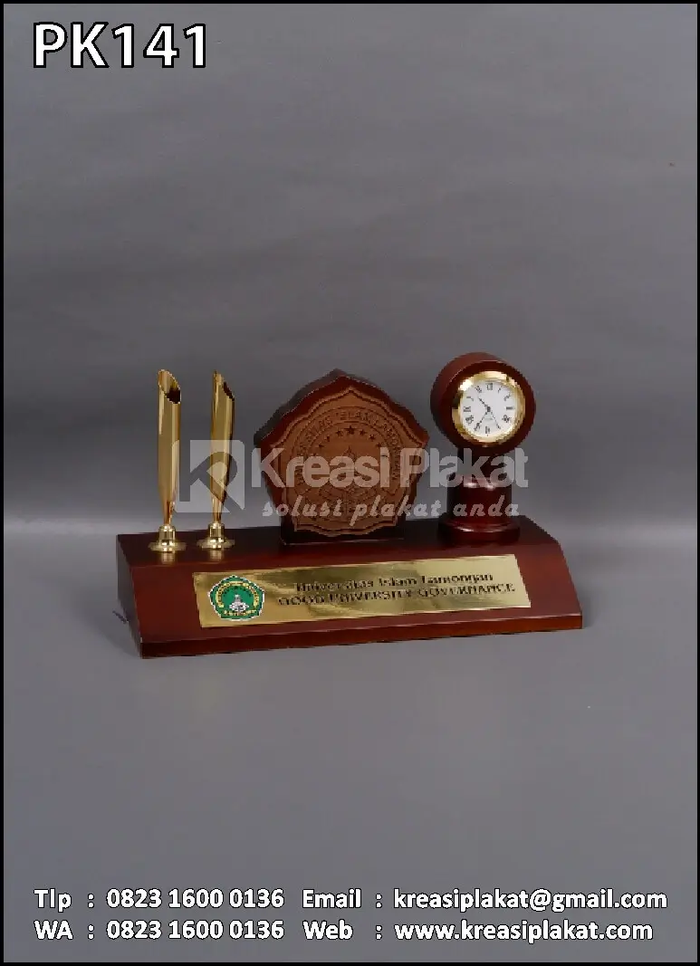 PK141 Plakat Kayu Pen Holder Universitas Islam Lamongan ini dibuat dari perpaduan bahan kayu dan logam, plakat ini menampilkan custom desain pen holder & logo universitas yang berkelas dan unik.